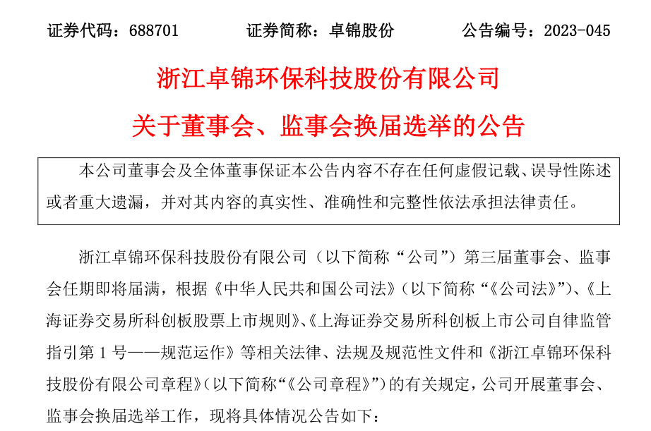 浙江卓錦環保科技股份有限公司關于董事會、監事會換屆選舉的公告