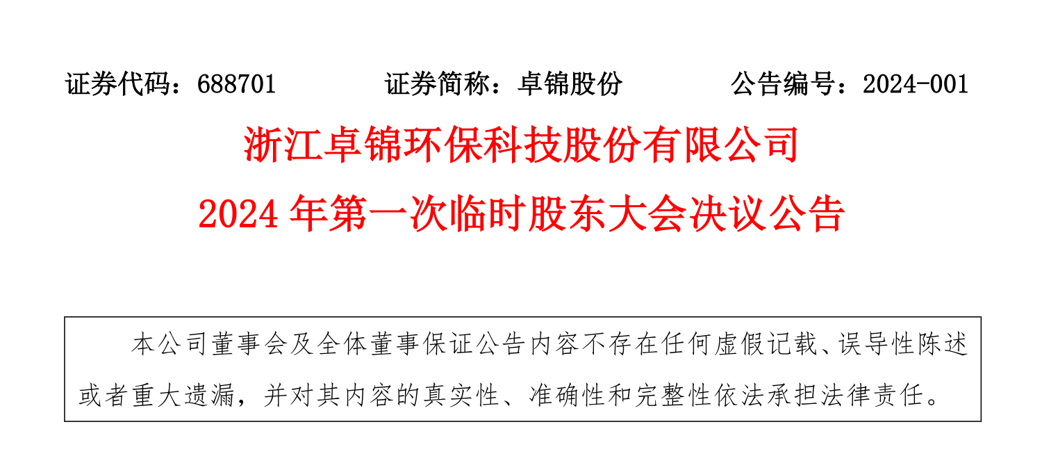 浙江卓錦環保科技股份有限公司2024年第一次臨時股東大會決議公告