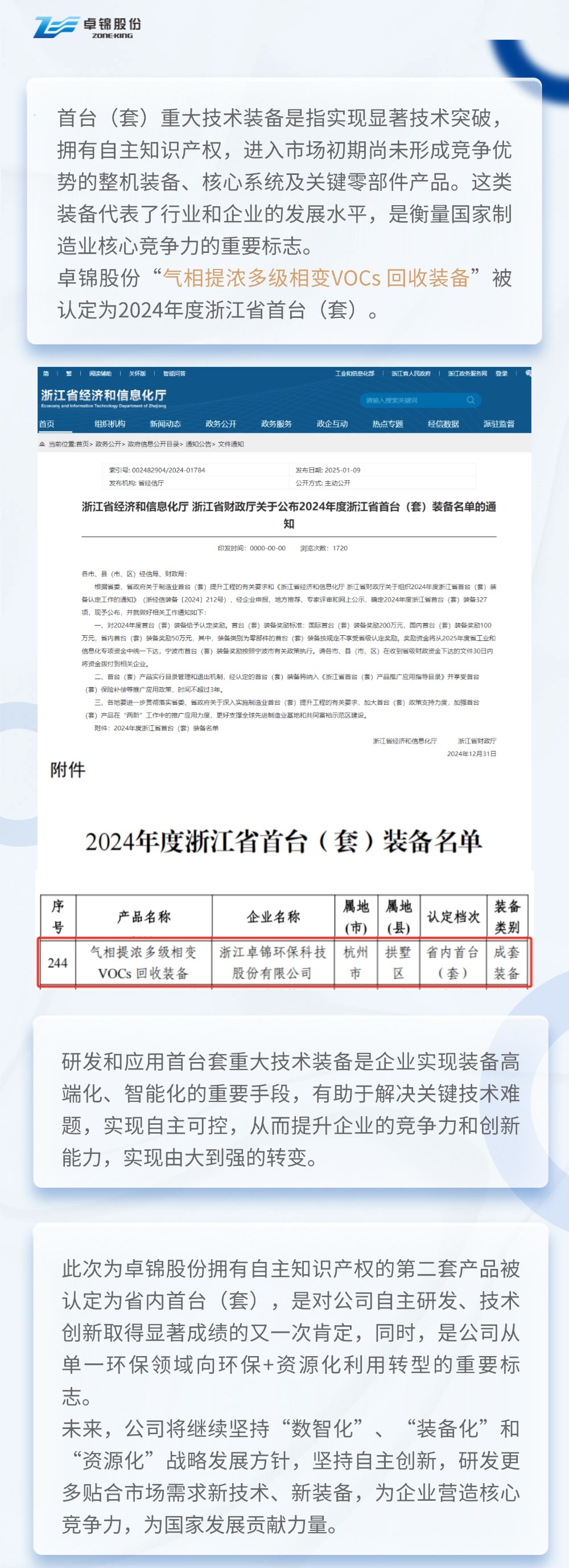 喜報 || 卓錦股份“氣相提濃多級相變VOCs 回收裝備”被認定為浙江省首臺(套)