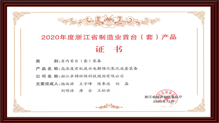 卓錦股份自主研發的“高濃度有機廢水電解催化氧化成套裝備”成功入選2020年度浙江省裝備制造業重點領域首臺(套)產品。